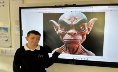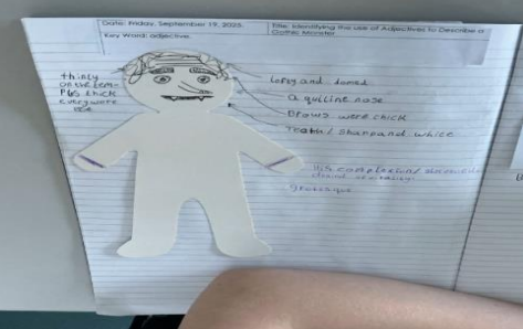 In English, we’ve been getting creative by designing our own monsters using descriptive writing techniques. We focused on using adjectives, noun phrases, and adverbs to really bring our creatures to life, and then used an AI generator to see what they would look like!