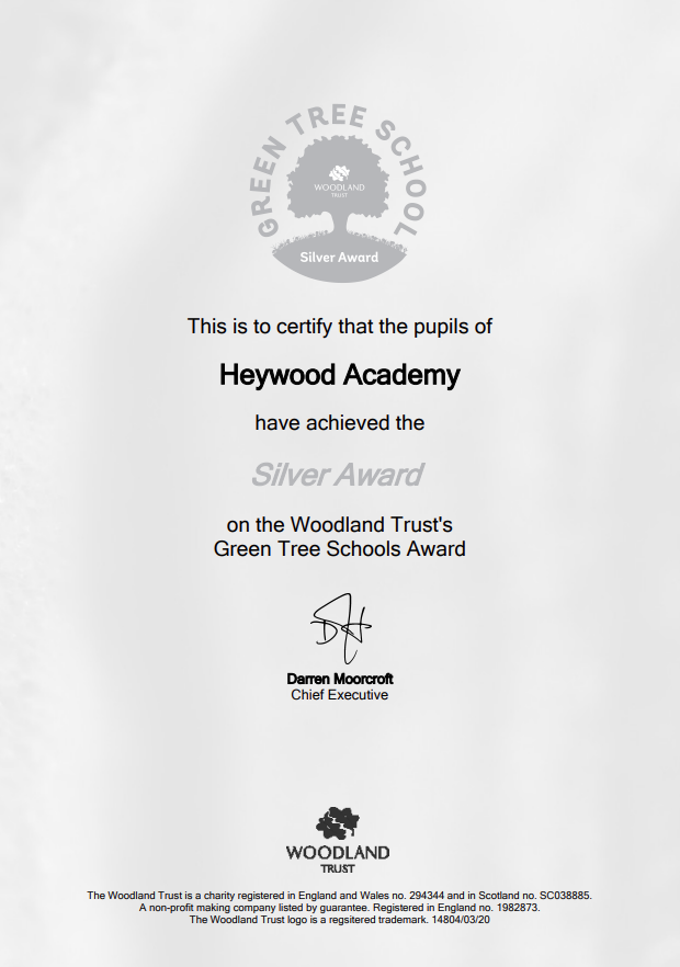 Heywood Academy is proud to announce that we have achieved our first ever award — the Bronze Award from the Woodland Trust’s Green Tree Schools Award!